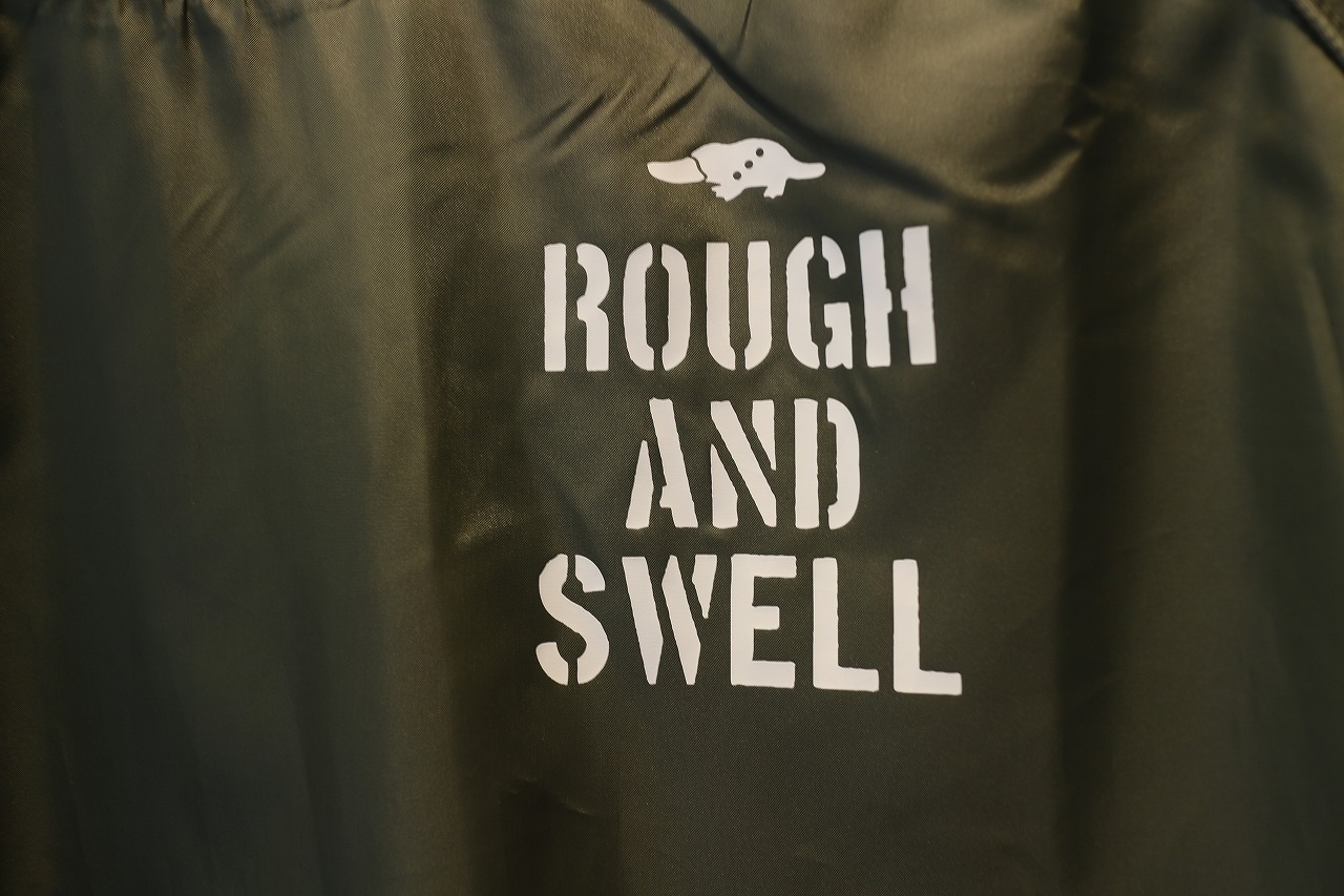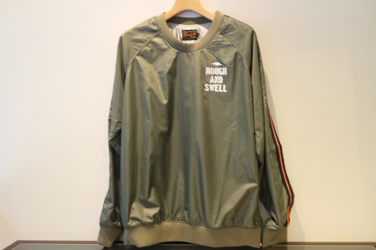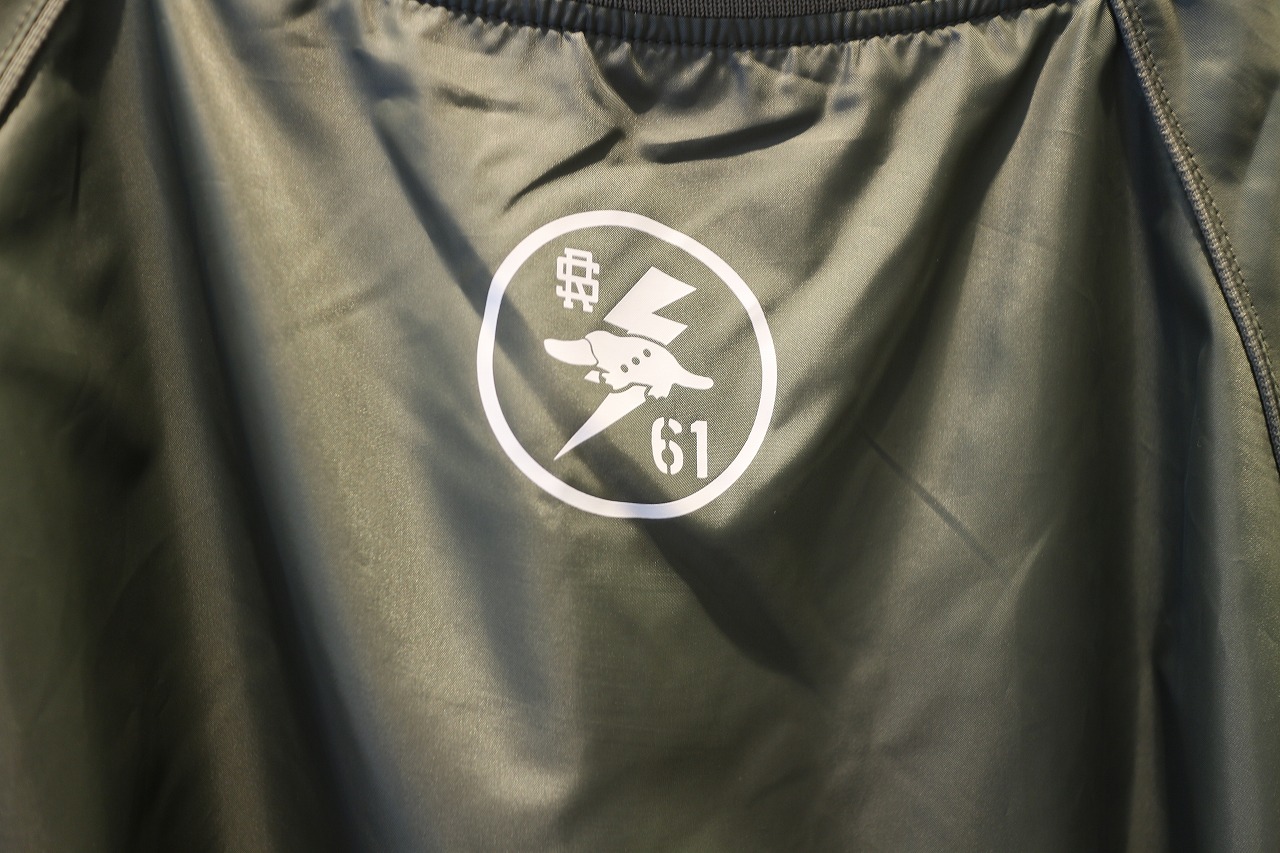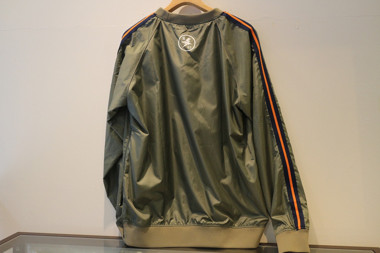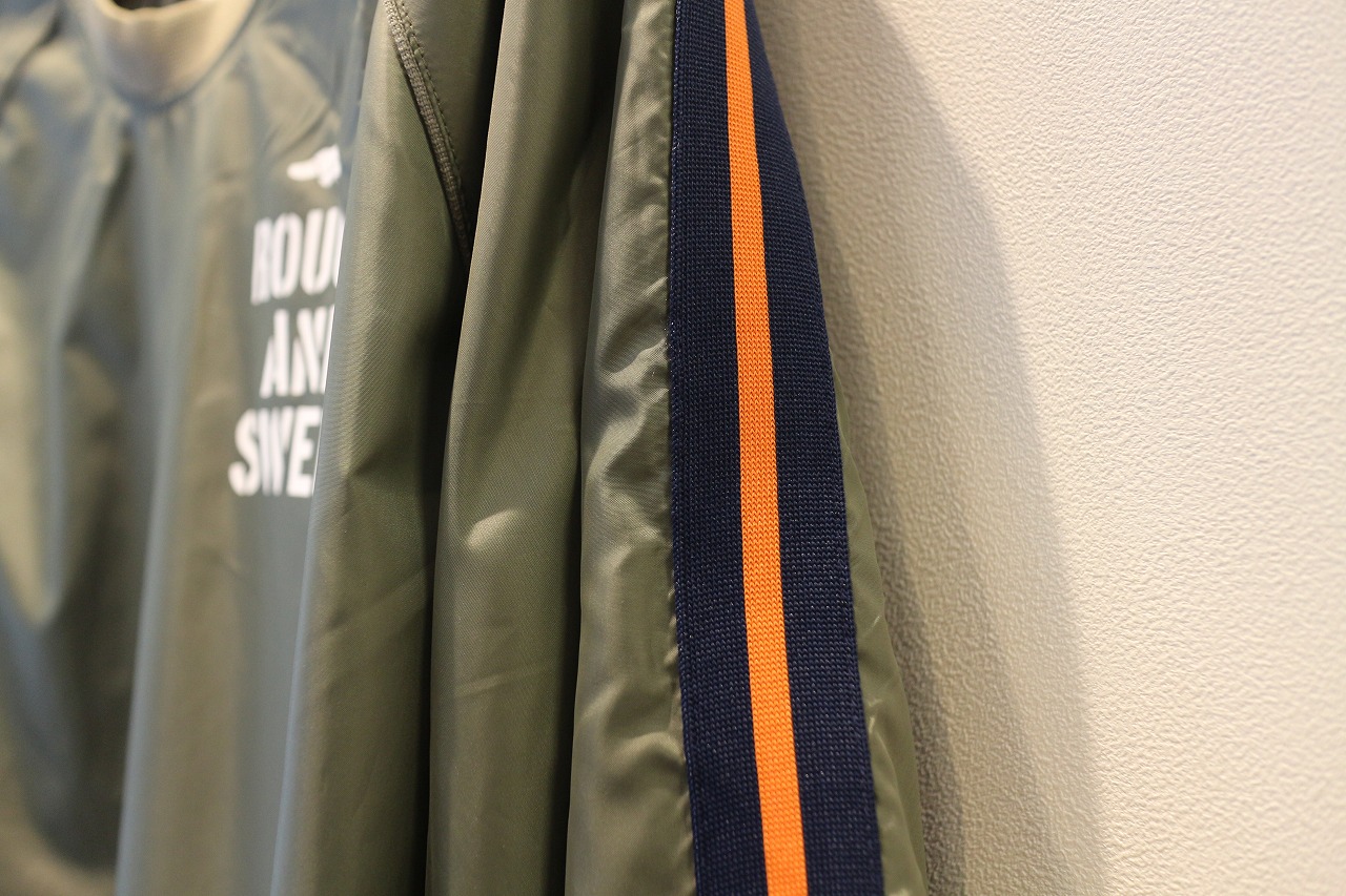 袖に配したストライプテープが効いた 「LIGHTNING SNEAD」ステンシルフォントとアースカラーでさりげなくミリタリーテイストに